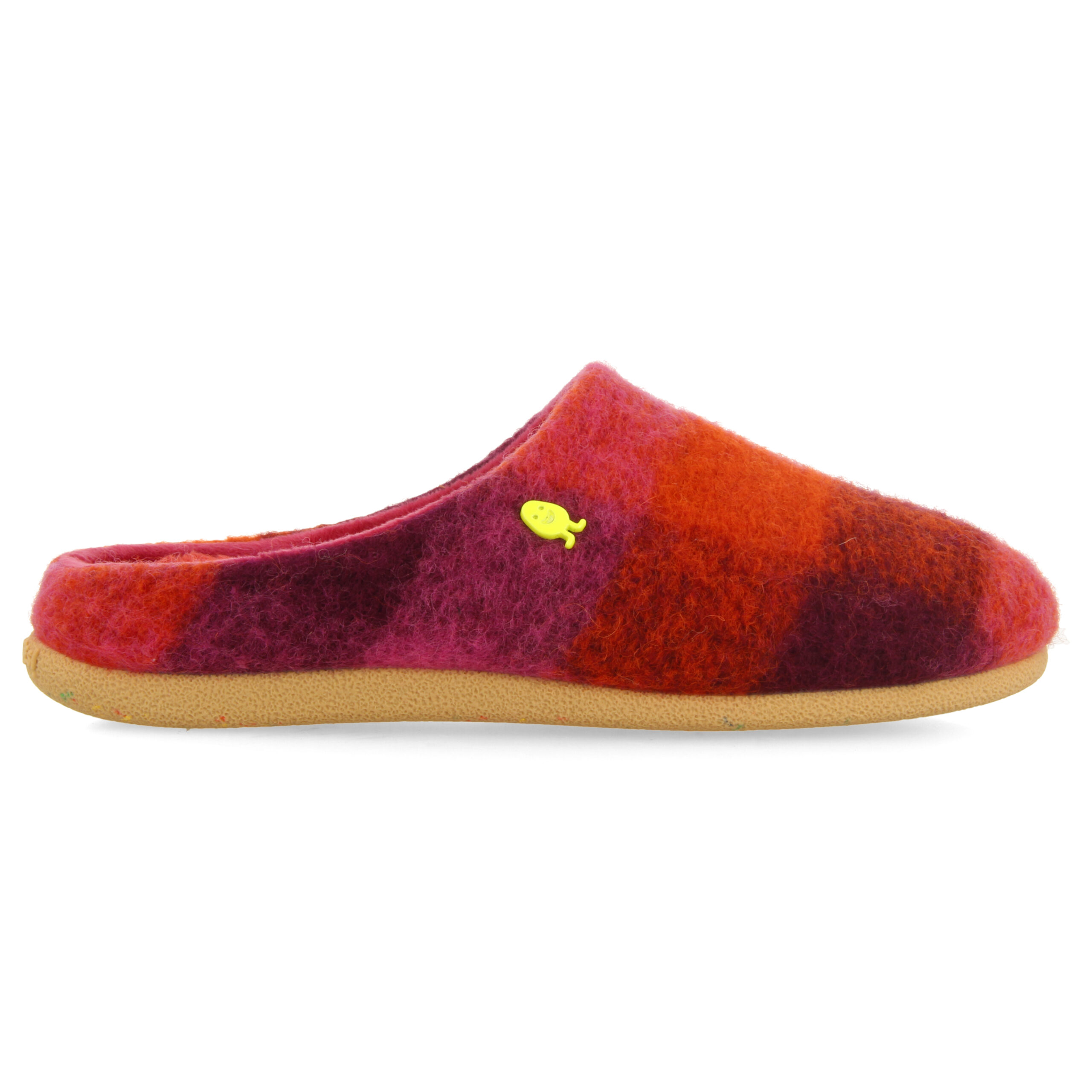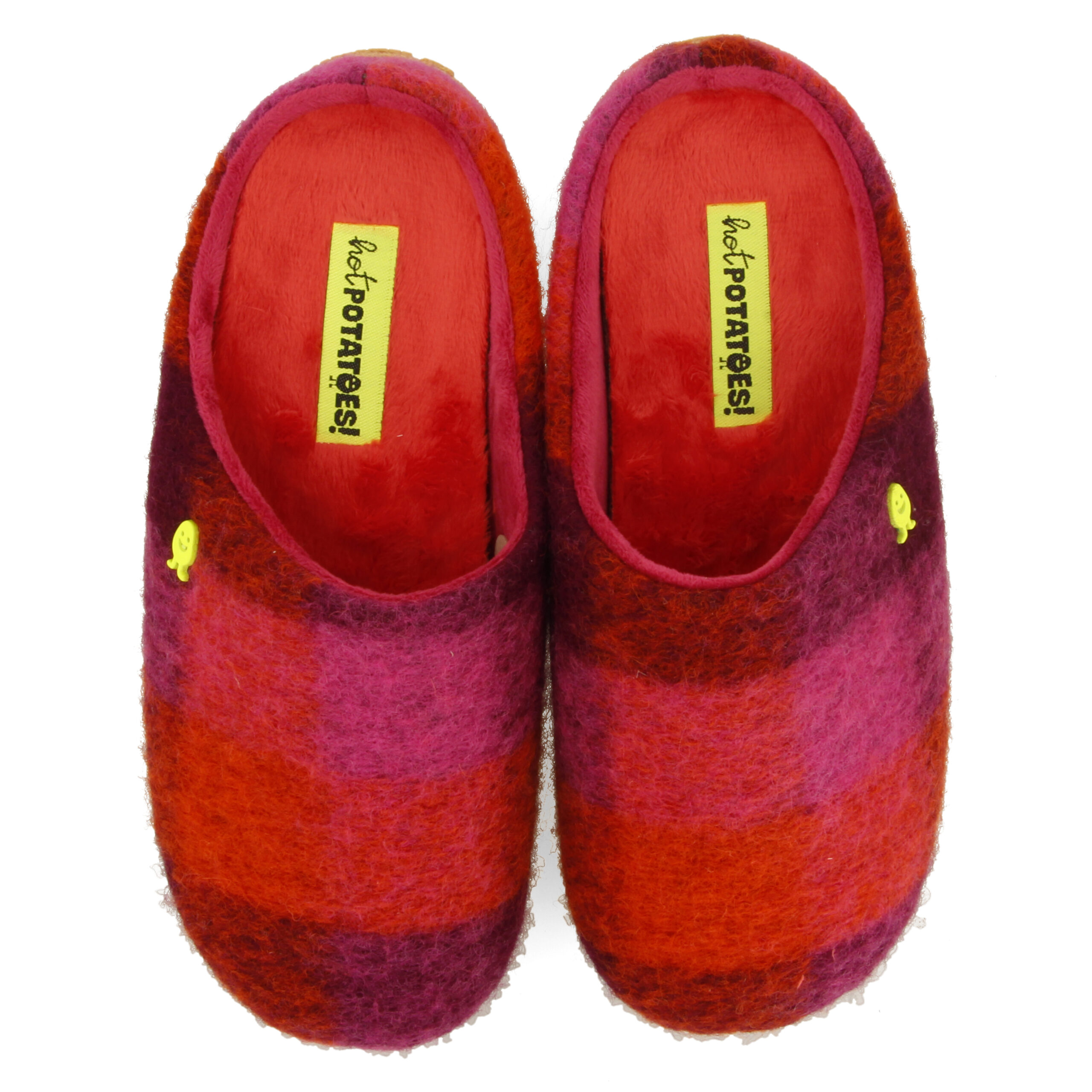 Kleur bekennen? Niet nodig met deze Hot Potatoes. Alle warme roodtinten in één. Makkelijk aan te schuiven en maximaal comfort door de zachte binnenzool en stevige buitenzool. | Hot Potatoes pantoffel voor dames. Comfortabel en Made in Spain. Vervaardigd van polyester en de zool is van natuurlijk rubber met gerecyclede kunststof snippers. Met uitneembare inlegzool van 100% gerecycled PU. Hot Potatoes zijn koud wasbaar.