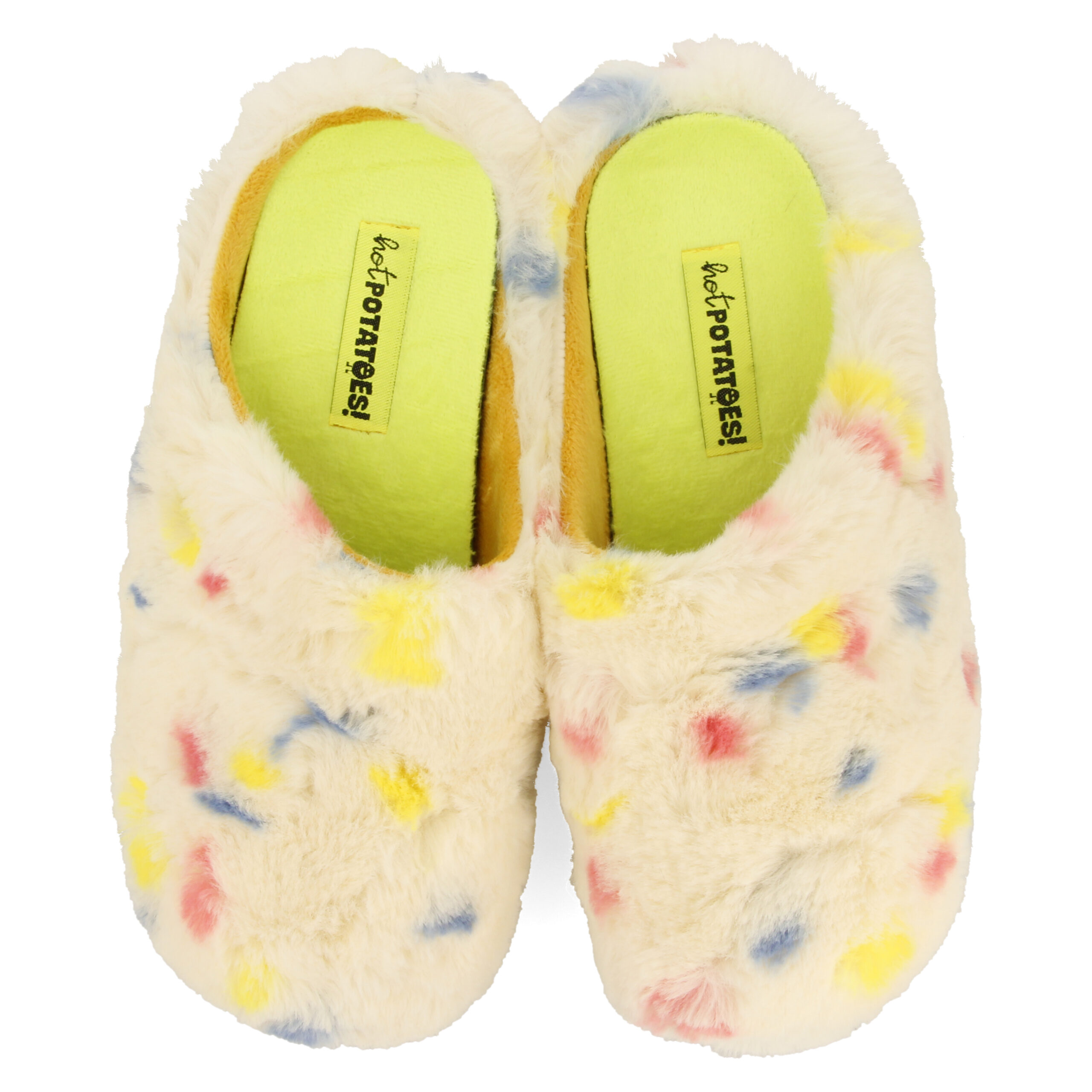 De confetti maakt het feestje? Niet als jij deze Hot Potatoes draagt. Jij bent het feestje met deze vrolijke en superzachte pantoffels. De stevige buitenzool zorgt voor het comfort die je voeten verdienen. | Hot Potatoes pantoffel voor dames. Comfortabel en Made in Spain. Vervaardigd van polyester en de zool is van natuurlijk rubber met gerecyclede kunststof snippers. Met uitneembare inlegzool van 100% gerecycled PU. Hot Potatoes zijn koud wasbaar.